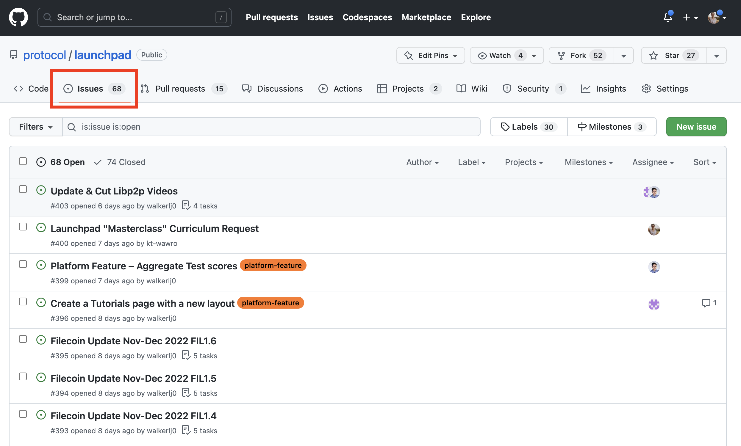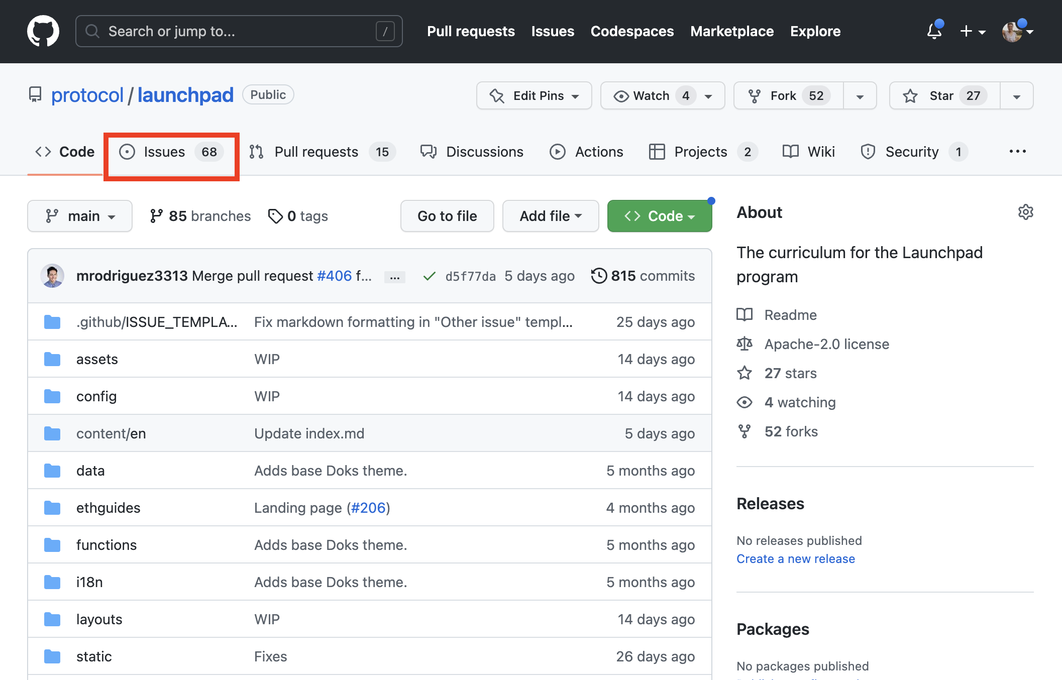 Open a repo. In this example, I will use the Launchpad Repo at https://github.com/protocol/launchpad.